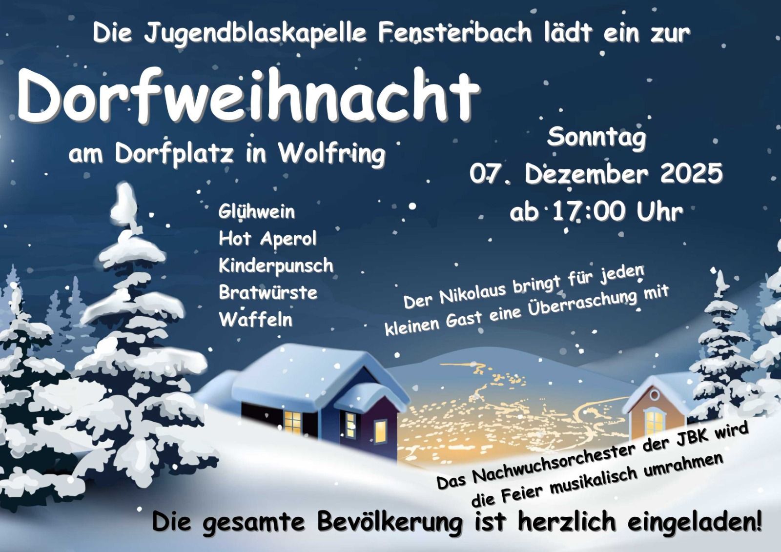 Wir laden zur Dorfweihnacht mit Nikolausbesuch, Verpflegung und musikalischer Gestaltung durch unser Nachwuchsorchester ein.